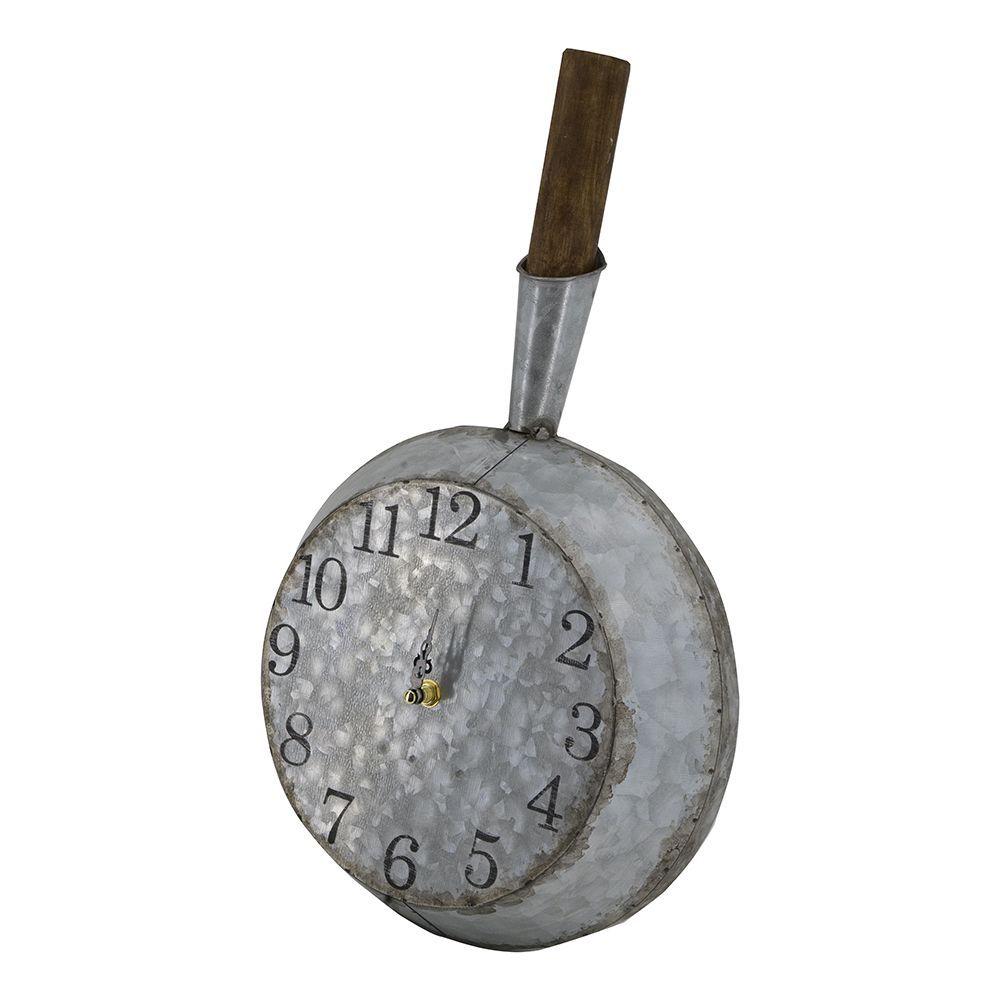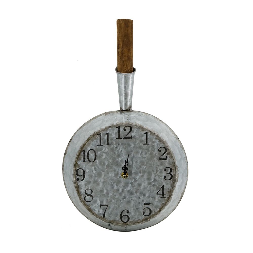 Time for a new accent on your wall? The Frye clock is perfect with its rustic pan-influenced design. Crafted in galvanized iron and wood, weathered numbers on the face and decorative black metal hands complete the look.