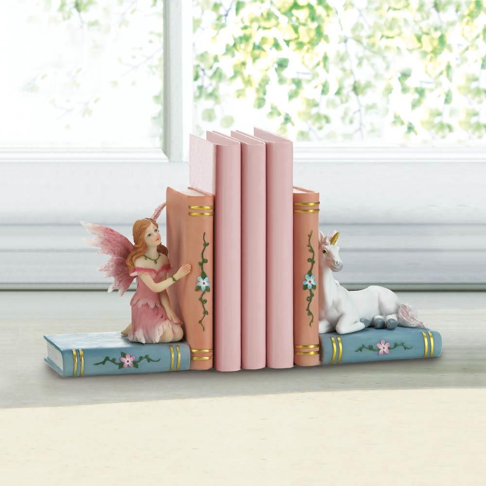 • Organize your child's room with a delightful fairy tale theme. This cute fairy dressed  in pink and unicorn with gold horn will happily display your child's favorite books. What a great addition to your budding scholar's room!