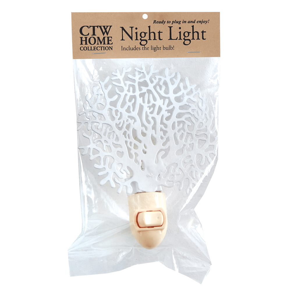 Add a coastal touch to your room with this coral night light. Our night lights come ready to sell. They include a night light appliance and a light bulb. This night light comes packaged for easy display in a bag with a header card. Replace with a 4 watt candelabra based bulb.